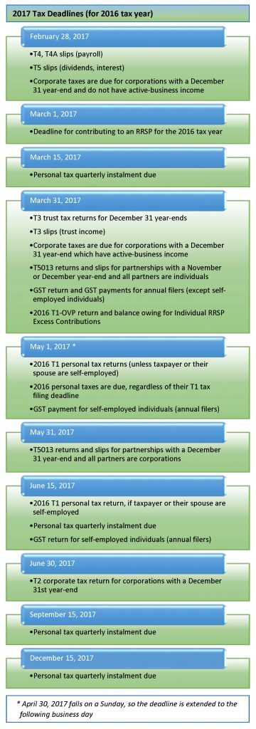 2017 Income Tax Deadlines (for 2016 tax year) - Canadians